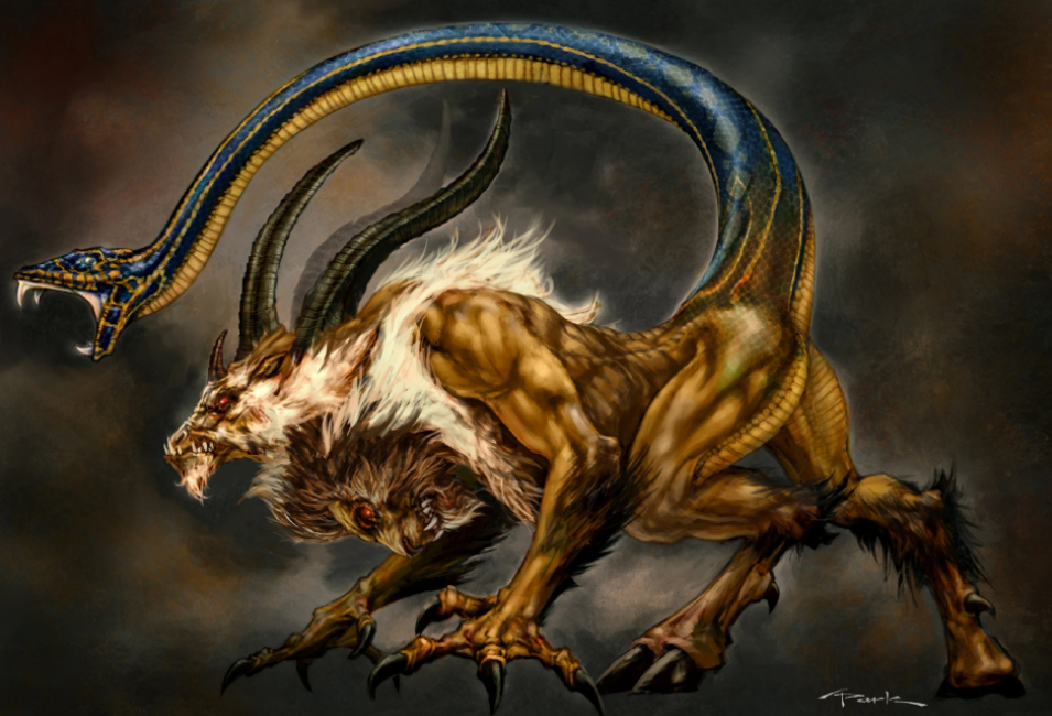 Chimera merupakan makhluk mitologi Yunani yang wujudnya mengerikan. Makhluk ini seperti penggabungan tiga hewan berbeda, yaitu tubuh dan kepalanya adalah singa, kepala kambing muncul dari punggungnya, dan ekor yang ujungnya berupa kepala ular.