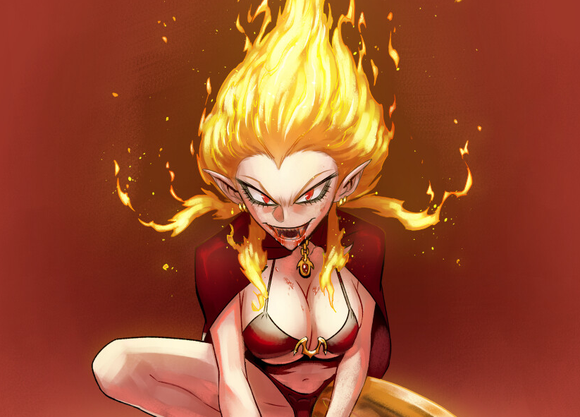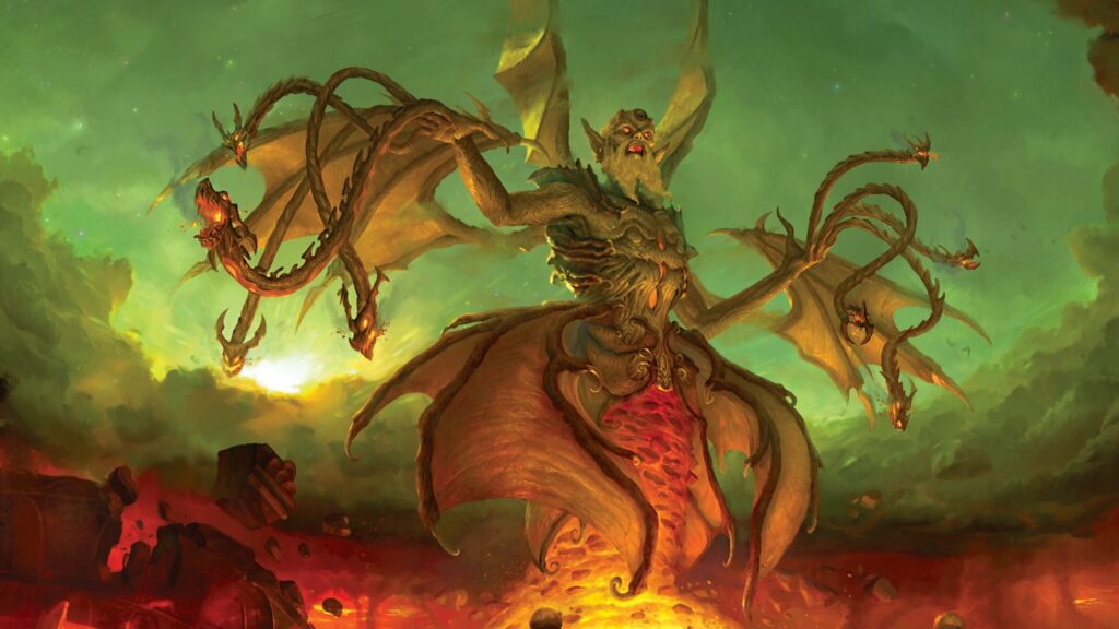 Bagian atas tubuhnya sebagian adalah manusia, tapi pada bahunya terdapat 100 kepala ular yang terus-menerus mendesis. Jari tangannya berupa kepala naga dan matanya memancarkan api yang bisa ia kontrol.